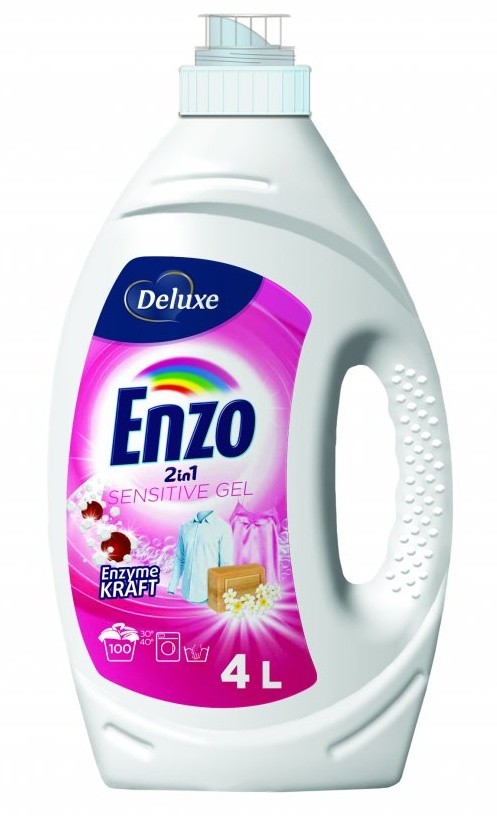 Deluxe Enzo prací gel SENSITIVE - tekutý prací prostředek na praní jemného prádla. Ideální čištění jemných tkanin, jako jsou: kašmírový, šifon, hedvábí, vlna, smíšené látky, látky všeho druhu. Působí i proti odolným skvrnám a zároveň chrání prádlo i pračku před usazováním vodního kamene díky obsahu změkčovače vody. Prádlo důkladně vypere a provoní příjemnou vůní. Nezpůsobuje alergie. Dá se použit i na praní dětského prádla. Vhodný pro použití ve všech typech praček a pro ruční praní.