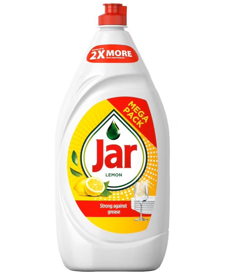 Každá kapka Jaru Lemon má extra dlouho trvající čisticí účinky, které od svého prostředku na mytí nádobí očekáváte. Jeho koncentrované složení si dokáže okamžitě poradit s mastnotou a vaše nádobí bude zářivě čisté. Je účinný u 100 % různých typů mastnoty z jídla. Tento základní tekutý prostředek na mytí nádobí Jar je tak koncentrovaný, že vám ke snadnému umývání nádobí bude stačit jen kapka: žádné namáčení, žádná mastnota, žádný problém.