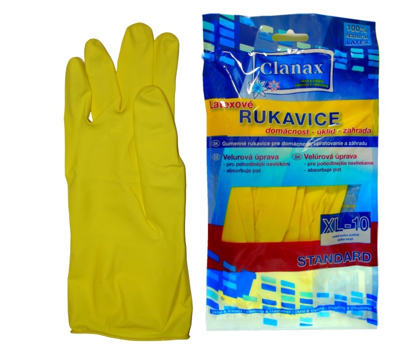 Úklidové latexové rukavice Clanax STANDARD velurová úprava vnitřního povrchu pro pohodlnější navlékání a absorbci potuprotiskluzové struktury na dlani a prstechbarva žlutávelikost XL - 10Tyto rukavice jsou vyrobeny z vysoce kvalitního latexu. Vnitřní povrch je…