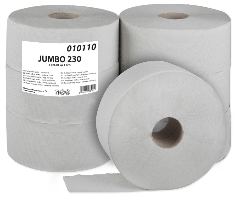 Toaletní papír JUMBO 1-vrstvýMax. průměr role: 230 mmŠíře role: 9 cmPrůměr dutinky: 6 cmOrientační návin: 180 mMateriál: recyklátBarva: šedáHmotnost (±5%): 0,60 kgPočet rolí v balení: 6Počet rolí na paletě: 480Cena za balení (6 rolí)