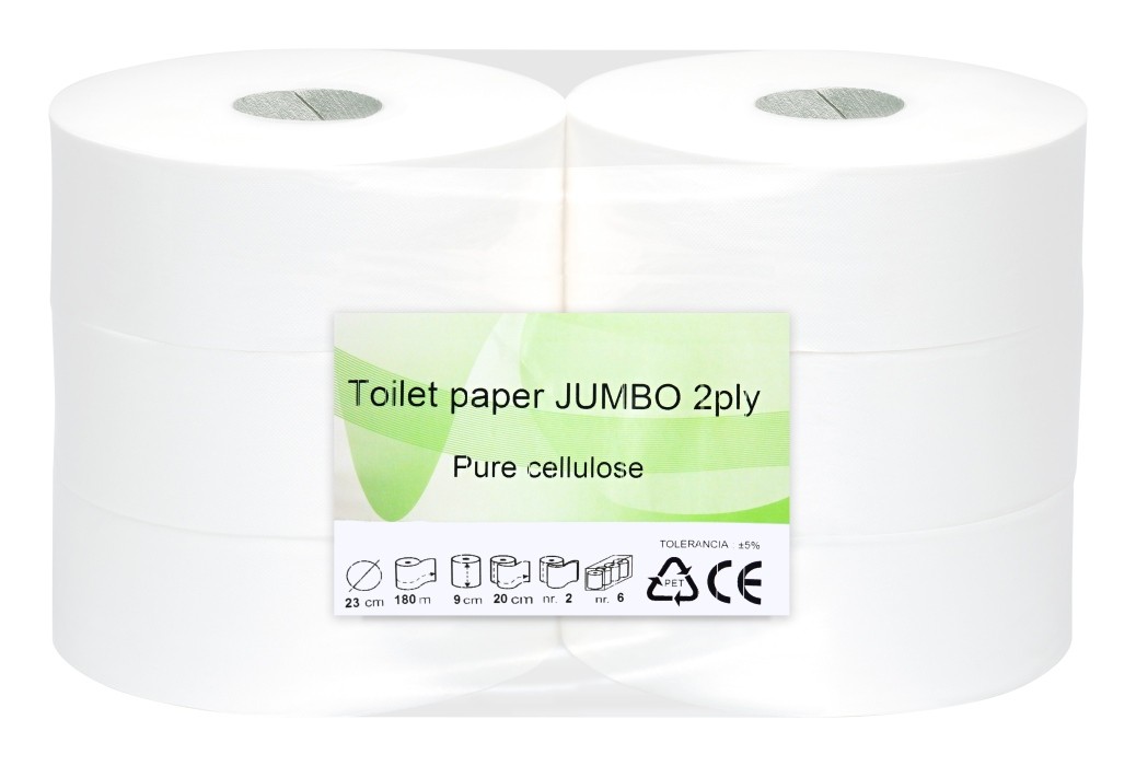 Toaletní papír JUMBO 2-vrstvýMax. průměr role: 23 cmŠíře role: 9 cmPrůměr dutinky: 6 cmPerforace: anoNávin (±5%) : 180 mMateriál: celulózaBarva: bíláHmotnost (±5%): 0,50 kgPočet rolí v balení: 6Počet rolí na paletě: 480Cena za balení (6 rolí)