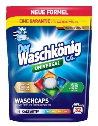 Waschkonig Universal 5-komorové gelové-práškové kapsle 32ks x 19g Novinka! Inovativní forma kapslí: prášek a gel spojují své vlastnosti pro ještě lepší výsledky praní. NEBEZPEČÍ - Způsobuje vážné podráždění očí. Je-li nutná lékařská pomoc, mějte po ruce obal nebo štítek výrobku.…